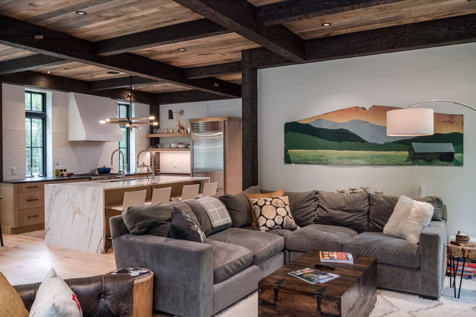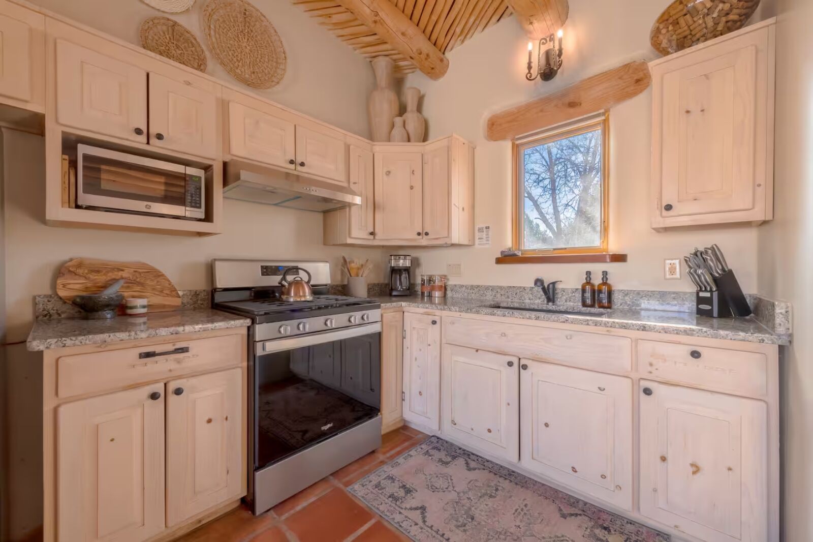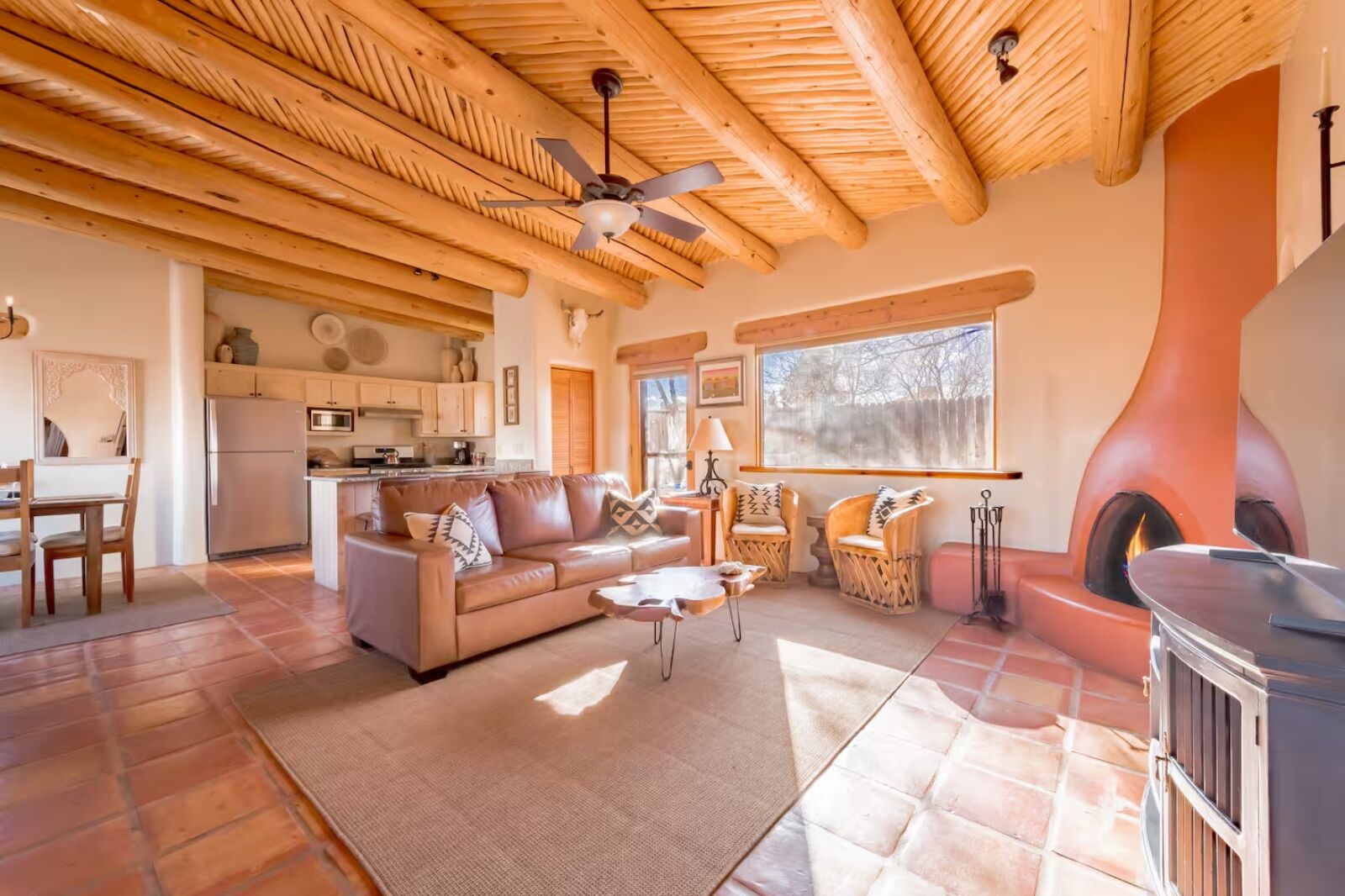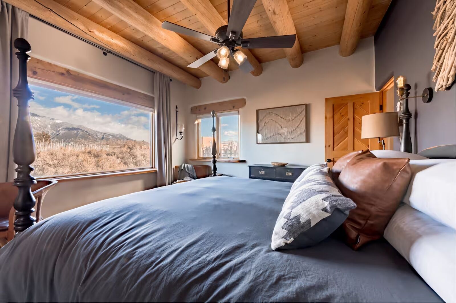 New Mexico doesn’t always make the winter short list, but Taos Ski Valley gets over 300 inches of snow a year, and there’s plenty of terrain. This stunning home sits on an acre in El Prado with epic views of Taos Mountain and classic adobe details — kiva fireplace, vigas, and latilla ceilings, and Saltillo tile. Taos Ski Valley is roughly a 25–30 minute drive away, and there’s a free shuttle from Taos and El Prado to the base on select days, if you’d rather leave the car at home. The two-bedroom, two-bath layout sleeps up to six with the living room’s queen sleeper. The kitchen has everything you need to cook at home, and Taos Plaza is just minutes away when you want dinner out.