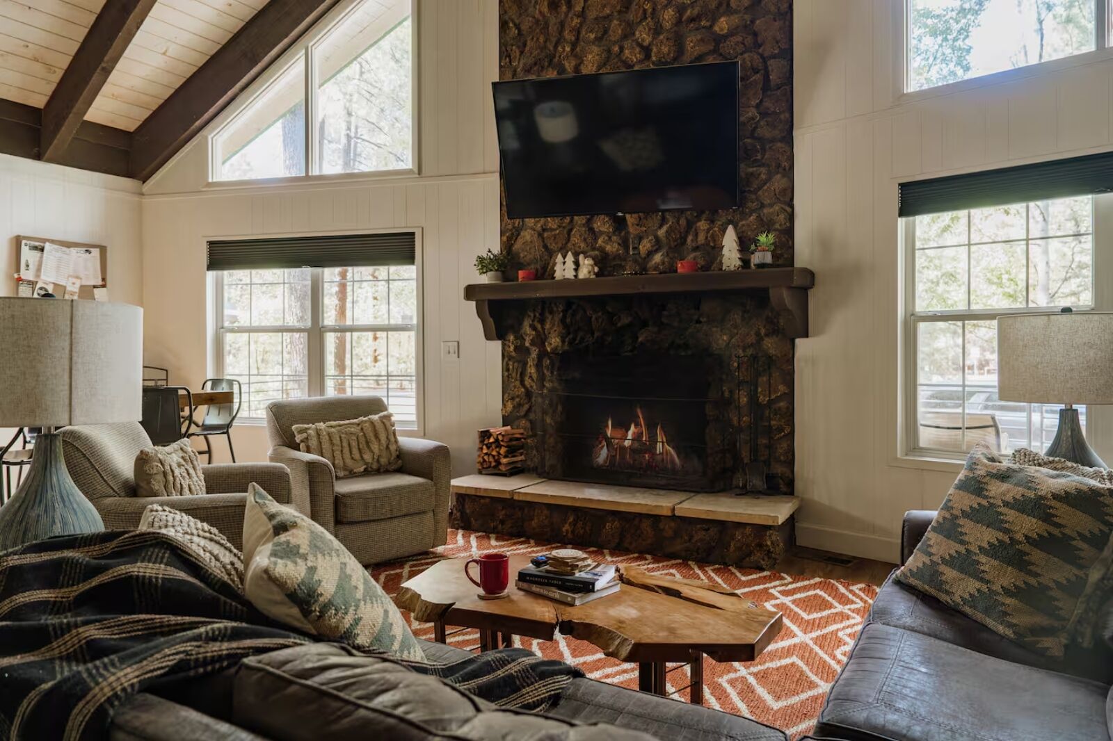 Hidden in the pines of Apache-Sitgreaves National Forest in Navajo County is this stunning all-black A-Frame. The cabin backs into the trees, but you’ll have stunning views from the front yard. The interior is stylish but warm, and there’s a star-gazing hot tub outside. It’s also less than an hour away from Sunrise Ski Resort if you want to hit the snow.