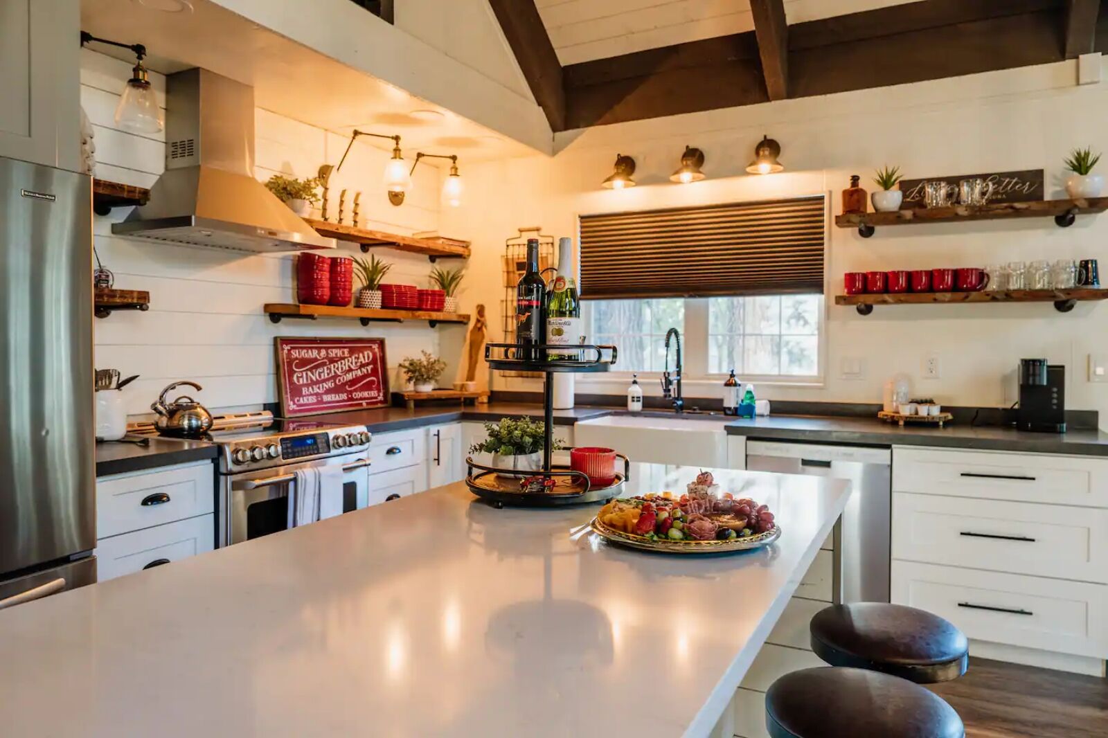 This custom-designed cabin, hidden amongst the pines of the San Jacinto Mountains, redefines mountain luxury with its sleek minimalism and breathtaking views. The spacious property has a modern living room with floor-to-ceiling windows framing vistas of the surrounding peaks and an open floor plan. You’ll need to layer up because the expansive decks and patios offer more vantage points to soak in the scenery, from the dramatic rock formations of Idyllwild to the seasonal creek below. It’s a short drive from some of Idyllwild’s most popular hiking and snow-shoe trails, offering opportunities to explore the rugged beauty of the San Jacinto Mountains — even in winter. The charming town of Idyllwild, with its eclectic mix of restaurants, shops, and galleries, is also a short drive away. And a local top deep tissue and reiki on-call therapist will happily stop by to massage all your holiday stress away.
